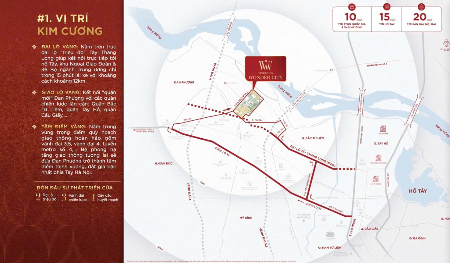Toạ độ giao thương thời thượng: Là điểm nhấn trong vòng liên kết các vùng đô thị phía Bắc Sông Hồng. Được bảo chứng từ bộ tứ cây cầu nối liền nội thành: Cầu Hồng Hà, Thượng Cát, Thăng Long, Nhật Tân, từ Vinhomes Wonder City, chỉ mất 20 phút đến sân bay Nội Bài và thuận lợi giao thương đến các thủ phủ công nghiệp Miền Bắc
